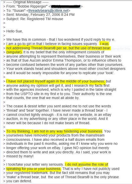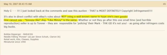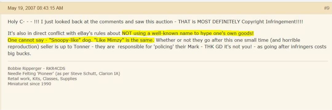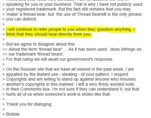 - Post 1-Bobbie is appalled by the use of a “well-known name to hype one’s own goods,” and that it’s wrong for someone to say “Like Mimzy,” then she justifies people using “thread bears” in post 2.