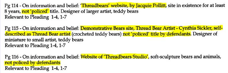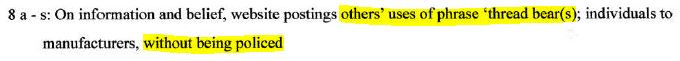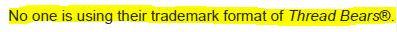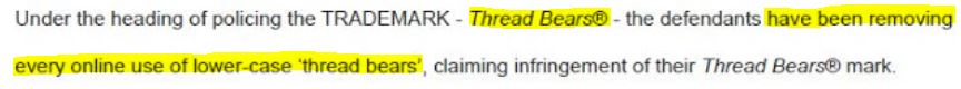 Bobbie is complaining that Thread Bears® is removing everyone using “thread bears.” But then she says in post 3 that there are websites using “thread bears” that aren’t removed (policed).