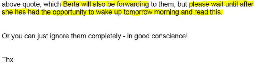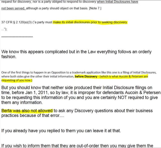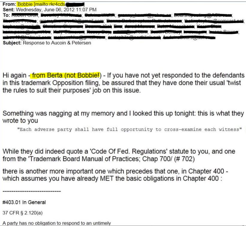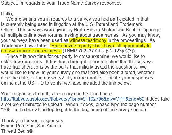 The first email says that Thread Bears® is cross-examining, not requesting Discovery like Bobbie/Berta says in post 2. Bobbie (rkr4cds) is also lying in post 2 by saying that it’s Berta, even though it came from Bobbie’s email. She even says “Berta was not allowed…” and “Berta will also be forwarding…”