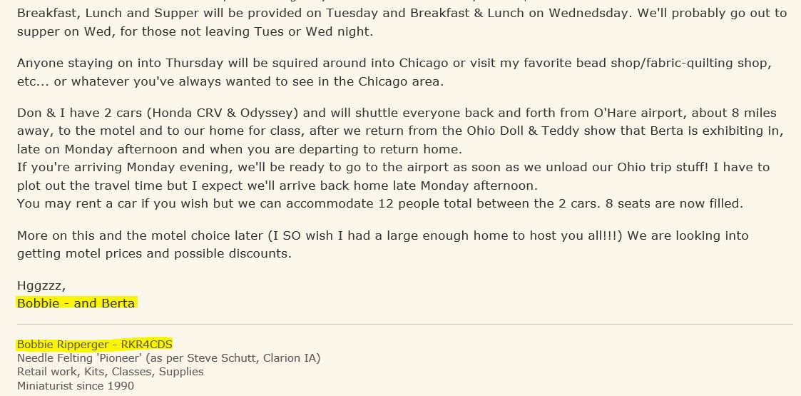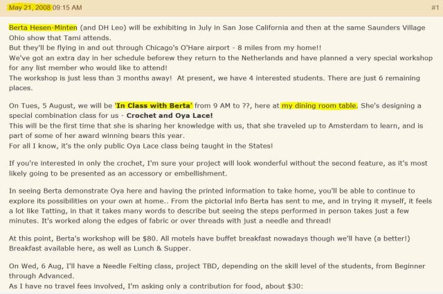 In 2005 (post 5) Bobbie talks about how Berta is her very good friend and talks about how they collaborate on projects. In post 4, Bobbie talks about how Berta was giving a class at her “dining room table,” and talks about how she works for Berta, driving around people for her class and coordinating her plans. Then four months later she acts like she doesn’t know Berta (post 3), saying that she had to google her to find her website, even though she clearly works for her by advertising for her, coordinating her plans, and emailing for her (like in post 2).