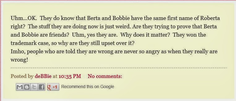 **Added 9/21/13: Bobbie was lying about who was sending/writing the email in Post 2 of this section. This is what Debbie had to say about it on one of her blogs dedicated to us. Again, another attempt to make people think they aren’t seeing what they actually are. How many of you have ever known Bobbie to refer to herself as Berta, or Berta as Bobbie??