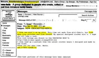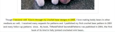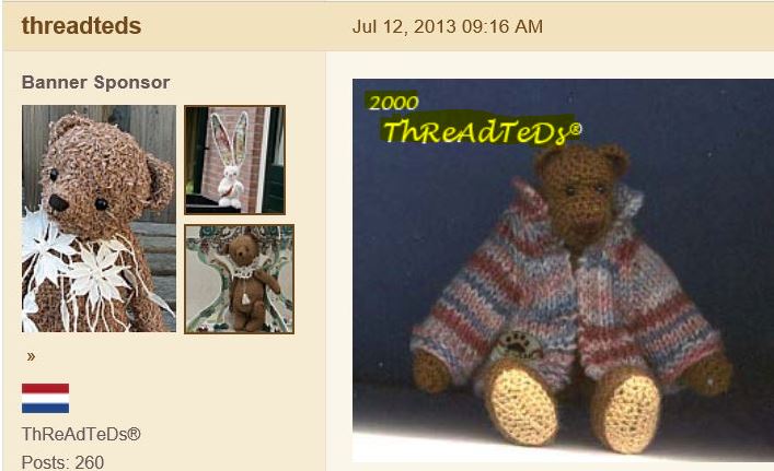 Al my writing in your postings about me is true, you make up your own lies. Nowhere in post 1 it says I START selling crochet bears in 2001, As you can read yourself I announce new finished crochet bears, not my first crochet bears. Yes, I became well known since I started selling on eBay in 2000. With eBay it was possible for me to reach more people. I sell my bears since 1999-2000, there are more places to sell bears besides on eBay. I make them even longer. And yes, at first my tradename was Bear-wear, but as you know in 2002 I changed to ThReAdTeDs®. and it has been ThReAdTeDs® since.
