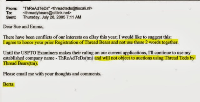 “There have been conflicts of our interests on eBay this year; I would like to suggest this: I agree to honor your prior registration of Thread Bears and not use those 2 words together.