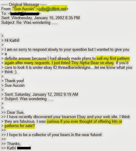 In post 1, Berta telling druannapegg “design your own” tells me she didn’t have any patterns available or that she ever made any. At that time, Sue was listing her pattern again (posts 3-6). By the time Berta had offered her patterns there were already some available, and makes her post 7 of why she came up with patterns (that there weren’t any) a discrepancy.