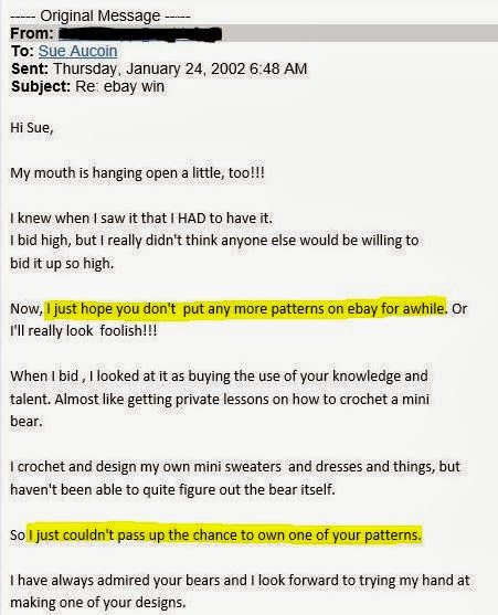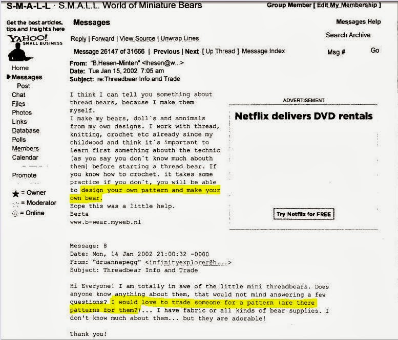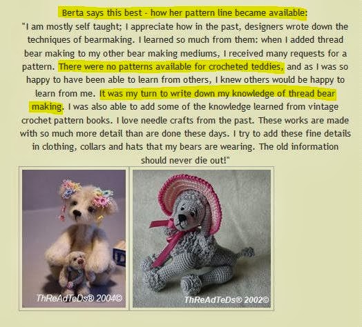 In post 7 Berta is saying that there weren’t any patterns for “crochet teddies,” but then says it was her “turn” to write down her “knowledge of thread bear making.” If there were no others, then how could it be her “turn?”