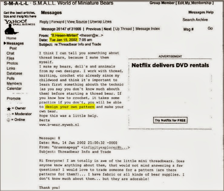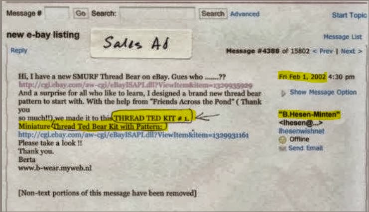 In post 4 Berta states sue was ‘upset and jealous’ because of her first pattern sale, but in section 3 Sue’s pattern sold for a high price which Sue sold before Berta (with Sue’s $280 receipt). She also says that nobody had sold patterns for these until she did in 2002, but in post 5 she states that she knew Thread Bears had sold patterns and kits from at least 2000.