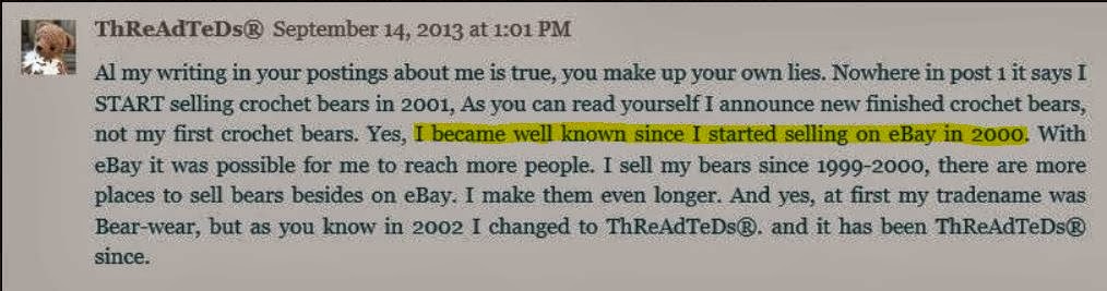We are giving Berta an opportunity to show evidence for her earliest advertisement of thread artist bears, since she has stated that the evidence we provided wasn’t her “first” announcement, just her “newest.” It is what it is, but we’ll give her an opportunity. So, Berta, where is your evidence?