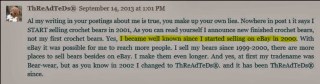 4 – <<"So what business is this of yours anyways? You don't crochet, you don't make bears, you don't do anything relative to our business, so why do you constantly feel the need to give your opinion of what we are doing or what we should be doing? If you really thought we were hurting our reputation by having this contest, you wouldn't care enough to comment.">>