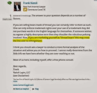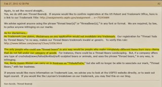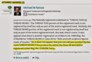 In post 8 Bobbie says that any artist using thread bear isn’t encroaching on Thread Bears®, but in posts 5-7, three different lawyers said: