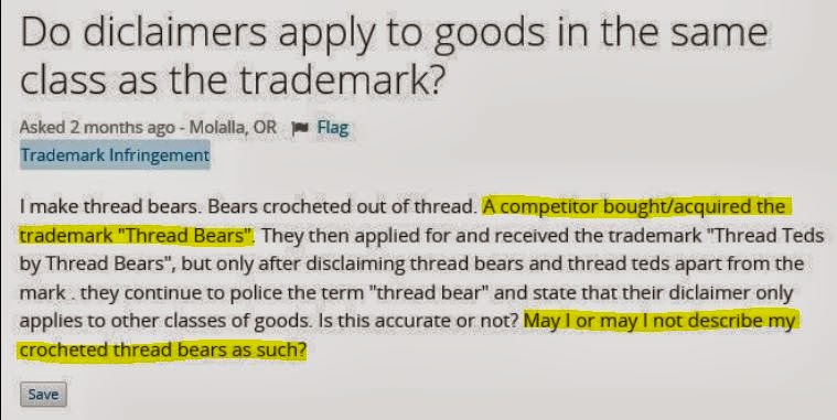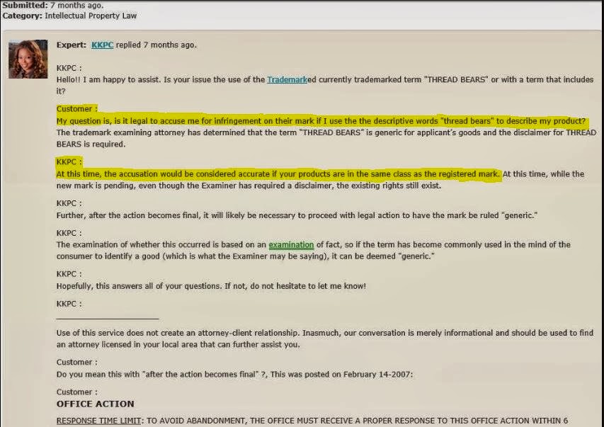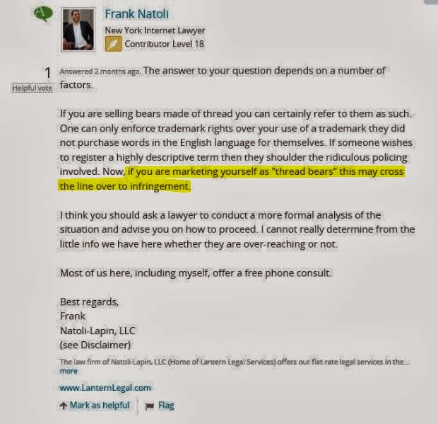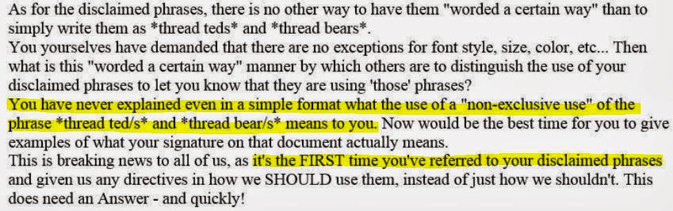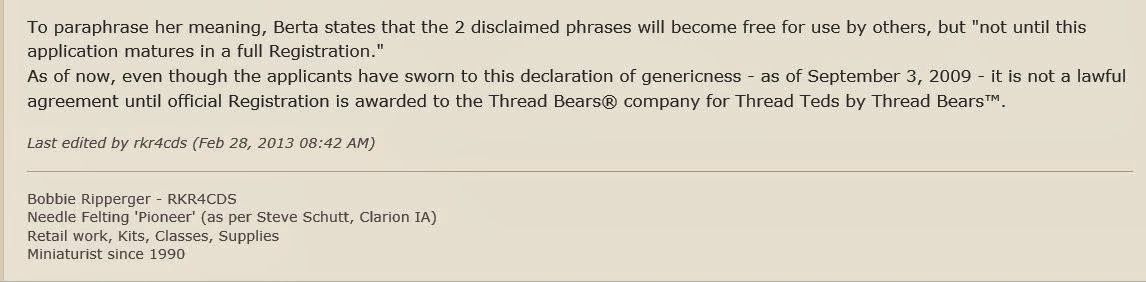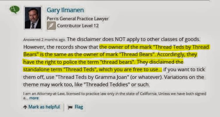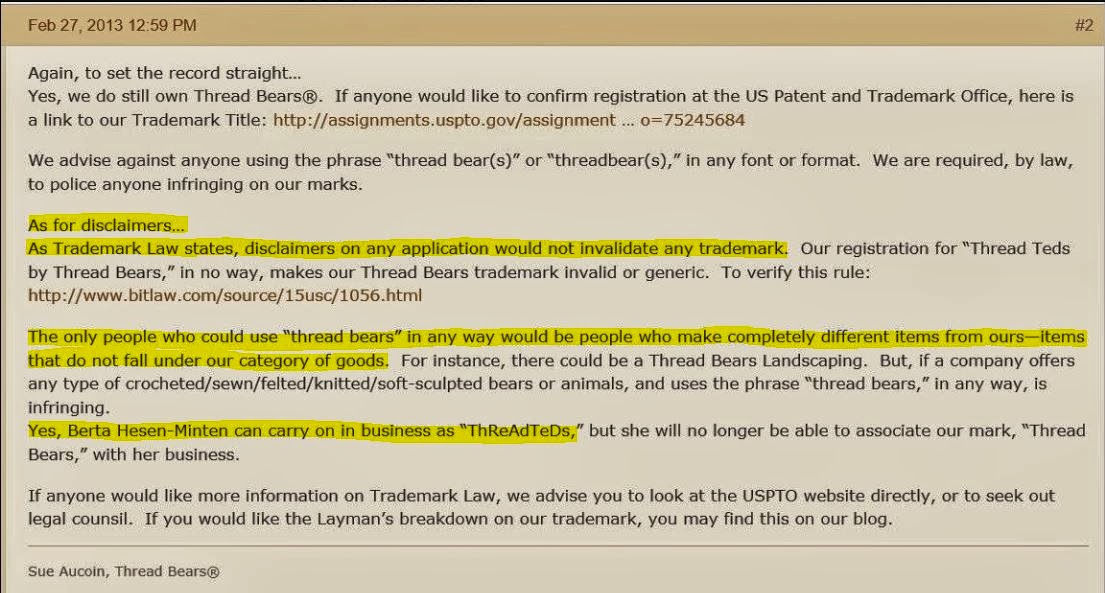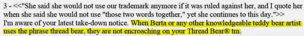 In post 8 Bobbie says that any artist using thread bear isn’t encroaching on Thread Bears®, but in posts 5-7, three different lawyers said: