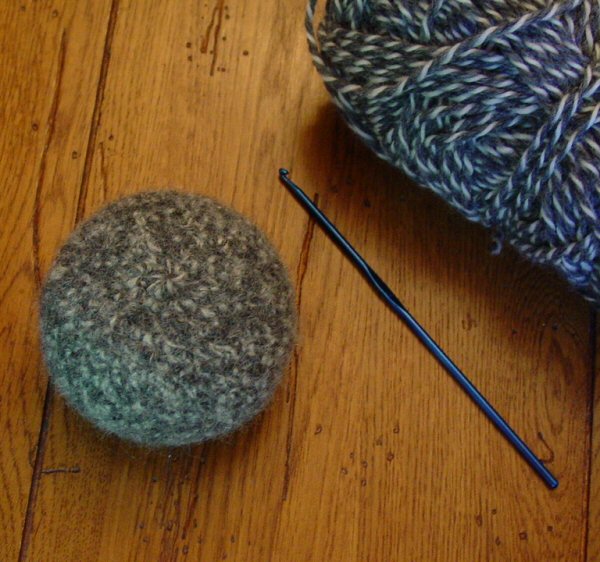 I hand crocheted him out of wool yarn and then put him through a washing process in order to felt/full his body for a more solid finish. This process takes time however, I love the finish results!